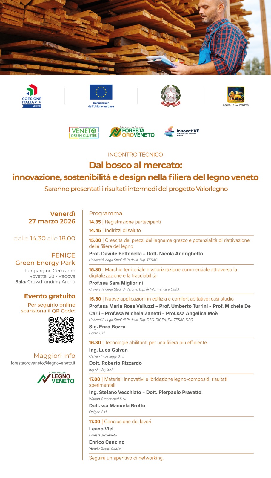 L’evento, si terrà il 27 marzo 2026 dalle ore 14.30 presso il FENICE Green Energy Park di Padova, e rappresenta un momento di confronto sui risultati intermedi del progetto di ricerca e sviluppo Valorlegno, ampliando lo sguardo su ulteriori scenari focalizzati sull’innovazione e la sostenibilità della filiera del legno veneto.