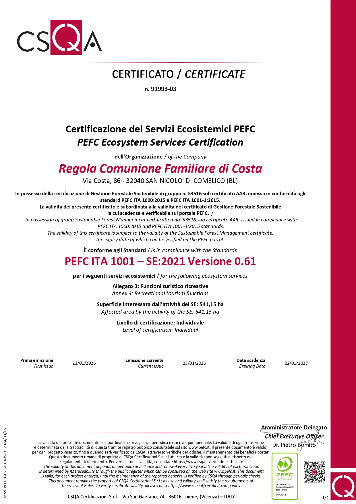 La Regola Comunione Familiare di Costa è certificata PEFC per i servizi ecosistemici funzioni turistico ricreative!